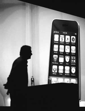 | ←苹果公司负责全球产品营销的高级副总裁菲利普·席勒站在放映第三代iPhone推广片的屏幕前。 新华社/路透 |