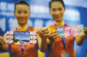 | 礼仪小姐现场展示海南省赠送给广西游客的旅游消费券。