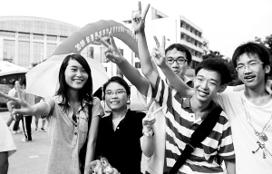 6月9日下午,高考结束,5名海南华侨中学的考生,步出考场,聚在一起兴奋地欢呼。 本报记者 苏晓杰 摄