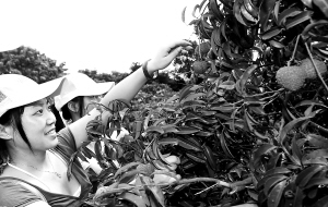 ← 6月9日,游客在海口市秀英区永兴镇农家荔枝园里采摘荔枝。