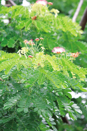 雨树属于含羞草科雨树类,形态特征主要有:落叶乔木,可高达20余米,胸径1.5米或更粗;树冠展开,顶端平,在夜晚或阴湿天气,就像含羞草一样使叶下垂;头状花序,花冠长约1.5厘米,黄色;花期2次,分春冬两季开花。 特约记者 孙清 摄影报道