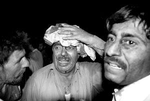 六月九日,在巴基斯坦西北边境省首府白沙瓦,一名被炸伤的男子捂着受伤的头部。 新华社/美联