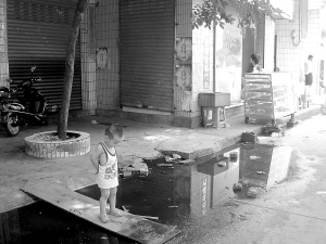 ← 下水道的污水溢出了路面。 本报记者 林伟 摄 |