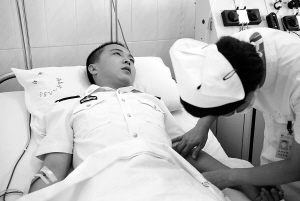 本报海口6月10日讯 (记者张苏民 苏建强 通讯员肖丹)今天上午,海南省人民医院血液科里气氛显得轻松愉快,海军某部军人小瞿正在这里接受造血干细胞采集。明天,他的造血干细胞将被送往上海,为一名33岁的白血病男患者送去生的希望。作为一名四川籍的军人,小瞿称,他和家人都将此举当作是灾区人民对社会的回报。