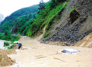 贵州榕江 出租车陷泥石流 6月9日,一辆出租车在贵州省榕江县境内321国道被泥石流掩埋。当日,贵州省榕江县遭遇强降雨,境内321国道边坡多处大面积坍塌,200多辆汽车被阻;在998公里处附近,泥石流将一辆出租车掩埋,幸未造成人员伤亡。经过奋战,榕江公路管理段的路政人员将遇险车辆救出,疏通了道路。 新华社发