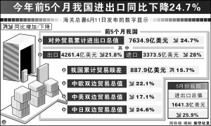 据海关统计,前5个月,我国外贸出口值累计同比下降21.8%,从上年11月份起出口已连续7个月下滑。5月份出口不仅同比下降26.4%,而且环比下降3.4%。同时,进出口总值、进口值也是同比、环比均下降。