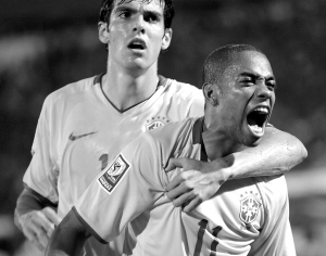 世界杯南美区预选赛 巴西力克巴拉圭 6月11日,在2010年世界杯足球赛南美赛区预选赛中,巴西队主场以2比1战胜巴拉圭队。这是巴西队在预选赛中的第七场胜利,目前他们积27分排名榜首,领先第二名智利队1分。图为罗比尼奥(右)进球后与队友卡卡一起庆祝。 新华社发