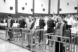 | 6月12日,被告人齐新、刘力男、杨森(从右至左)在庭审现场。
