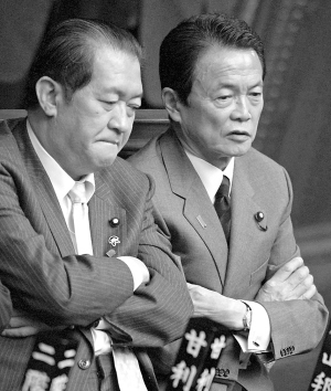 | 图为鸠山邦夫(左)和日本首相麻生太郎在东京出席众议院会议的资料照片(摄于2009年3月4日)。 新华社/法新 |
