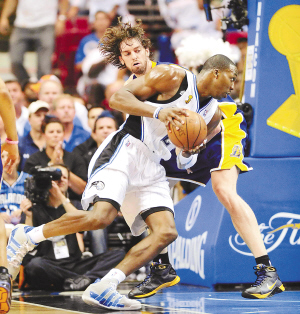 本报讯 北京时间6月12日,NBA总决赛第四战在奥兰多进行,在“小鱼儿”费舍尔关键时刻“魔术般”三分球帮助下,湖人队经加时客场以99:91击败魔术队,在七战四胜的系列赛中以3:1拿到了“赛点”。
