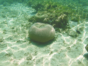 | 一块沉在永兴岛海域的紫色滨珊瑚。蒋斌 摄 |