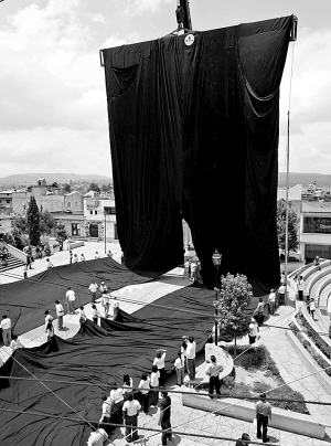 6月14日,一些墨西哥人在墨西哥州的阿尔莫洛亚展示一条60.1米长的裤子,试图打破最长裤子的吉尼斯世界纪录。 新华社/法新