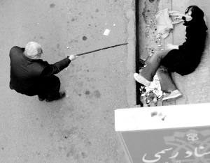 | ←6月14日,在伊朗首都德黑兰市中心的一次抗议活动中,一名男子用拐杖指向一名倒地的妇女。 新华社/路透 |