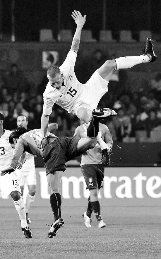 16日,在南非比勒陀利亚举行的联合会杯小组赛的一场比赛中,意大利队以3:1战胜美国队。在另一场比赛中巴西4:3胜埃及。 图为美国队球员德米里特(上)在争顶头球。 新华社发