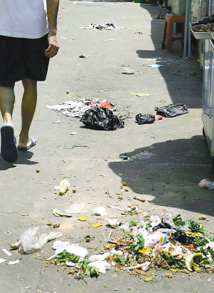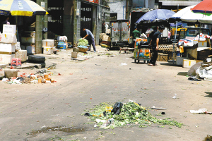 海口大英农贸市场外,路上堆着烂菜叶和煤渣 |