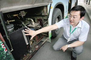 6月16日,一款“不用给油、也能起步”的新型节能公交车日前亮相“2009中国北京国际节能环保展览会”。这种新型公交车在安装了“液压能量再生装置”后,节能效率超过20%。 据悉,“液压能量再生装置”可以在公交车减速或制动过程中积蓄能量,在公交车加速或启动过程中将能量快速释放来代替部分燃油。这样,汽车启动或加速时不需要再次踩动油门便可带动汽车前行,速度表上的指针很轻松地迈过了每小时30公里,司机可以直接挂上三挡,再踩下油门。而这一起步过程,不需要一滴燃油。 新华社记者 张舵摄