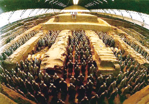 今天,在秦始皇兵马俑博物馆里,人们被这支跨越了时空的虎贲之军震惊了:面积庞大的3个兵马坑内,近万个手执弓、箭、弩、戈、矛、戟等各种武器的陶质卫士,分别组成了步、弩、车、骑四大兵种,真实而生动地再现了2000多年前中国历史上第一个大一统帝国皇家军队的威严阵容。此外,8000多件陶俑陶马和4万多件青铜器,无一不是国宝级的珍品。