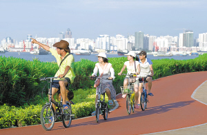 6月19日傍晚,在海口西海岸,来自广东工业大学的4位学生骑着自带的自行车,感受着这座海滨城市的美丽、舒适、轻松与惬意。 本报记者 王凯 摄