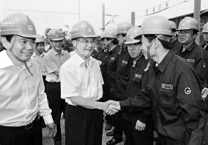 | 6月20日,温家宝在秦皇岛港务集团公司考察时与工人握手。 新华社发 |