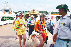 | 三亚的碧海蓝天和国际品牌酒店,吸引了众多游客。图为6月21日下午外国游客登陆蜈支洲岛。 本报记者 古月 摄 |