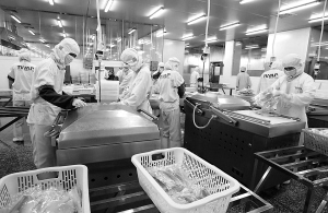 | 6月17日,在老城开发区内的通威(海南)水产食品有限公司生产车间,工人们正在加工打包罗非鱼等产品。今年1月—5月,在国际金融危机蔓延的大背景下,老城开发区依然取得了良好业绩,区内企业总产值达44.1亿元。