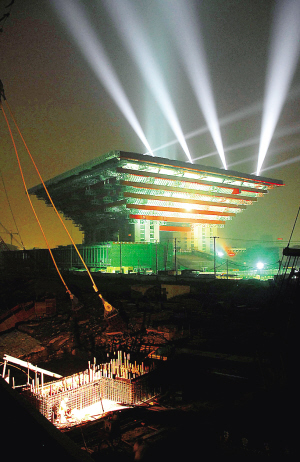 6月22日晚,2010年上海世博会中国国家馆通电试灯,灯光将中国馆点亮。目前,中国馆已进入内部装饰阶段。 新华社发