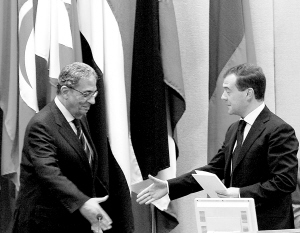 ←6月23日,在埃及首都开罗的阿拉伯国家联盟(阿盟)总部,俄罗斯总统梅德韦杰夫(右)演讲结束后接受阿盟秘书长穆萨祝贺。穆萨当日表示,阿盟支持俄罗斯在莫斯科举办中东和会,以推动中东和平进程向前发展。 新华社/路透