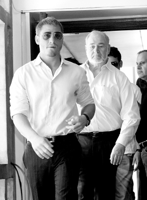 6月24日,以色列前财政部长亚伯拉罕·希尔赫森(左二)随儿子巴拉克(左一)一同走出特拉维夫地方法院。希尔赫森当日因盗窃、诈骗等罪名被法院判处有期徒刑5年零5个月。 新华社/路透