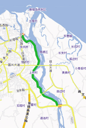 根据规划,滨江带状公园(见左图)位于南渡江畔,从新埠桥到南渡江大桥带状分布,全长12.4公里。项目规划面积191公顷,其中河滩绿地面积135公顷,路到堤之间的陆地面积25公顷,道路中间绿地面积31公顷。