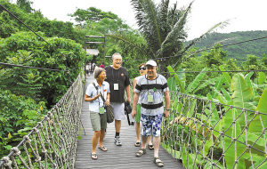 六月二十二日,保亭黎族苗族自治县三道镇的海南呀诺达雨林文化旅游区,几位外国游客在长七十二米的雨林吊桥上穿行,欣赏海南热带雨林风光。这里生长着一千四百多种乔木、一百四十多种南药、八十多种热带观赏花卉和几十种热带瓜果。