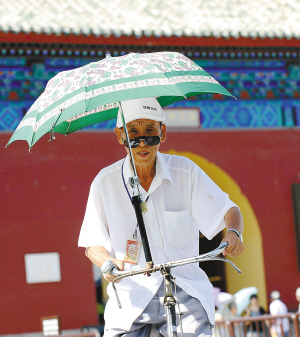 ← 6月24日,一位老人在自行车上安装了一把遮阳伞在北京街头骑行。 新华社记者 李文摄