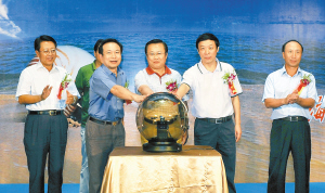 | 6月28日上午,南海网海南岛国际旅游网、海网宽频开通(播)仪式在海口举行。图为副省长林方略(中),省委宣传部常务副部长张松林(右二),海南日报报业集团党委书记、社长王绥雄(左二)共同按动水晶球,启动南海网重点项目。 本报记者 王凯 摄 |