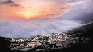 | 清晨的梯田,在朝霞和浓雾中倍显妩媚。 |