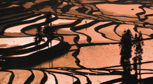 站在高坡上看着,随着夕阳西下,梯田逐渐由淡红变成红色、粉红色、白色。万蛇群舞般的田埂线条,雕刻出层层叠叠通往天际的梯田。而我们这些观景中的人,也成了这浪漫景色中的点缀……