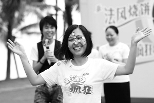 6月28日,数十名白领网友聚集在海口皇冠假日酒店前沙滩上,参与南海网与肯德基“法风烧饼”举行的“让我们一起疯狂一把———大笑更疯狂”互动活动,网友Polly185赢得大笑冠军。在优美的自然环境里,网友们舒展身心,消除了平日的工作压力。 本报记者 苏建强 摄