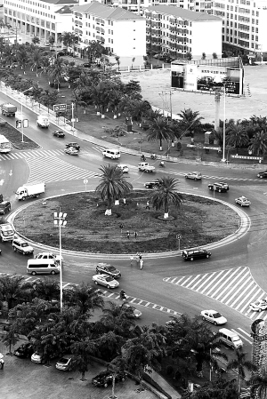6月26日上午,在三亚市迎宾路和凤凰路交叉路口大转盘,工人们正在移植转盘原有的树木等。城市管理部门经过调查研究,决定对该交叉路口的大转盘进行改造,以减轻交通压力。 本报记者 程范淦 摄