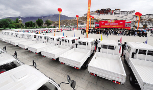 6月29日,为西藏行政村配备的农用运输车停放在布达拉宫广场。当日,党中央、国务院为“西藏百万农奴解放纪念日”向西藏农牧民群众赠送物资仪式在拉萨举行。新华社发