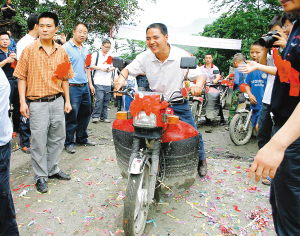 6月29日,汶川县水磨镇连山坡村村民骑着摩托车行驶在崭新道路上。当日,四川省汶川县地震后首条村民自建道路通车,这条道路1.5公里长,投入约30万元。 新华社记者 刘海 摄