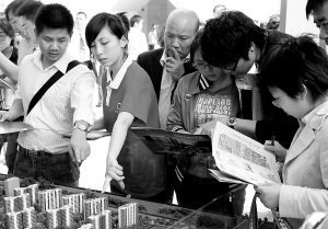 上半年上海一手商品住宅成交量较去年同期增长70%。图为日前上海一楼盘销售人员(左二)向购房者介绍楼盘。 新华社发