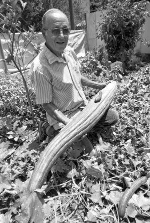 7月1日,以色列人伊扎克·雅赞帕纳在特拉维夫附近的佩塔提克瓦的自家菜园里展示一条118厘米长的大黄瓜。伊扎克希望将这条黄瓜巨无霸载入《吉尼斯世界纪录大全》。 新华社/法新