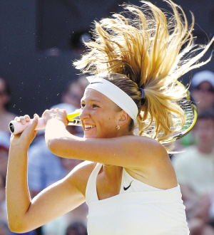 费德勒3:0卡洛维奇 6月30日,在温网女单四分之一决赛中,小威以2:0战胜阿扎伦卡。图为阿扎伦卡的一头金发在阳光下格外亮眼。 新华社发