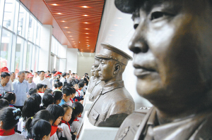 7月1日,参观者在瞻仰铜像。 当日,首批42尊井冈山革命斗争时期领导人及革命先烈半身铜像落成揭幕仪式在井冈山革命博物馆举行。据悉,八一南昌起义、井冈山革命斗争时期领导人及革命先烈半身铜像共100尊,其中71尊将安放在井冈山革命博物馆,29尊将安放在南昌八一起义纪念馆。这组雕塑制作去年12月启动,雕塑家们在查阅参考了200多万字的文字材料和1500多张图片后,精心创作完成。同时,铜像还配有触摸屏基座,将领导人和革命烈士的生平资料、相关照片和影像录入其中。 新华社记者 季春鹏 摄