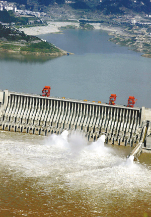 由于连日持续降雨,已进入主汛期的长江三峡水库入库流量大增,三峡大坝开启两个深孔和一个排漂孔泄洪(7月1日摄)。 新华社发(文振效 摄)