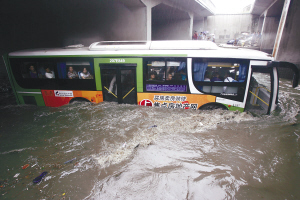 6月30日,武汉市区道路积水严重,车辆在水中行驶犹如行舟。近日来,武汉连降暴雨,造成市区严重积水,给城市交通和市民生活造成较大影响。 新华社发