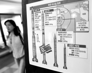 | ↑ 7月2日,在韩国的京畿道坡州的一处观察哨所,一名韩国游客经过一幅显示朝鲜导弹系统的图表。 新华社/美联 |