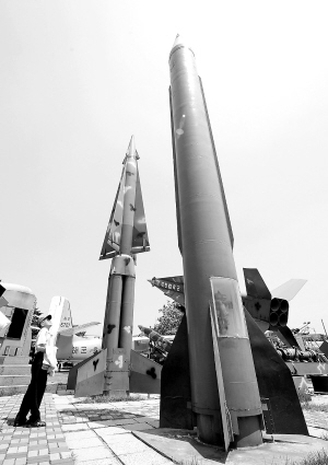 | ← 在韩国首都首尔陈列的朝鲜导弹的模型(右)。 新华社/法新 |