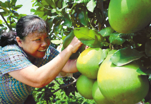 | 屯昌县藤寨乡大路坡村村民王桂霞看着自家挂满黄金蜜柚的果树,心里乐开了怀。这种果树是她儿子2005年在中国农业大学读书期间,从福建省的蜜柚中筛选改良培育出的新品系,于2007年在大路坡村试种成功。 本报记者 苏晓杰 摄 |
