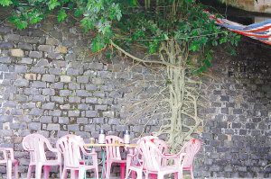 在定安县定城镇白蒙路,有2棵大榕树长在墙壁上,造型奇特,郁郁葱葱。据了解,这2棵榕树已扎根在墙上近10年了。 本报记者 洪宝光 摄