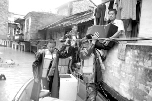 7月3日,在广西融水苗族自治县融水镇济安街,民兵帮助被洪水围困的居民转移财产。 7月2日至3日,广西部分地区出现大雨到暴雨,局部大暴雨,暴雨中心位于河池市罗城和柳州市融水、融安、三江以及桂林市兴安、临桂一带。截至3日14时,共造成27.68万人受灾,4人失踪。 新华社发
