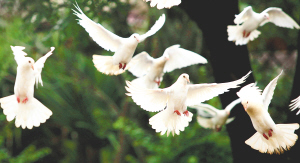 | ↑体态洁白展翅优雅的广场鸽,给人一种和谐悦目的感觉。 |